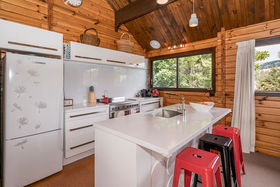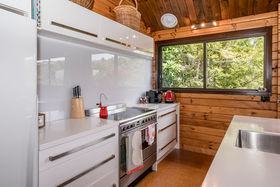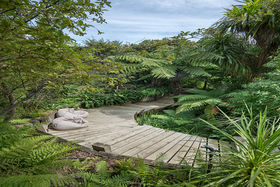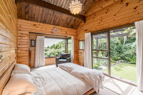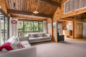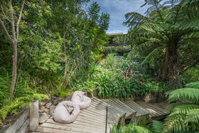 This delightful, north-facing home and garden has been harmoniously designed with low maintenance in mind so that you can appreciate your surroundings rather than be tied to them. Each of the living and three bedrooms open to the decks and garden creating a wonderful indoor/outdoor flow. The décor fits perfectly with the surroundings enhanced by the greenery outside. For the practical, there are places for cars and a workshop.
